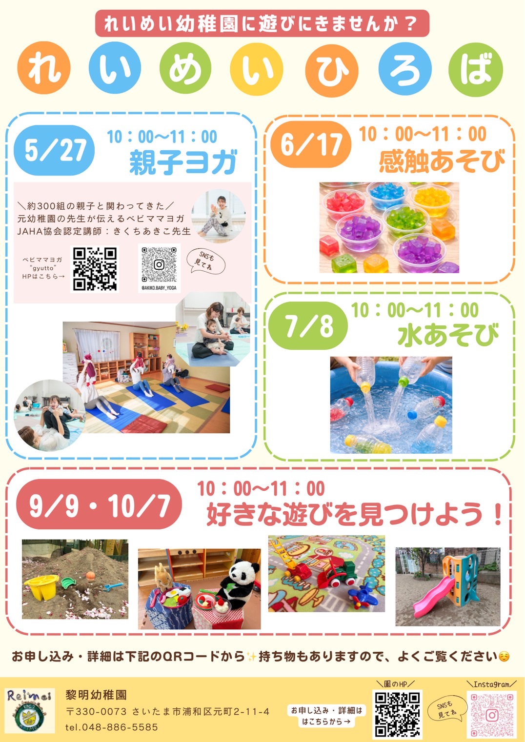 | 開催時間 | 【親子ヨガ】定員15名まで 日時:5月27日(水)10:00~11:00 <持ち物> ・上履き(外履の底を拭いたものでも可) 【感触遊び】定員30名 日時:6月17日(水)10:00~11:00 <持ち物> ・上履き(外履の底を拭いたものでも可) ・全身の着替え 【水遊び】定員30名 日時:7月8日(水)10:00~11:00 <持ち物> ・上履き(外履の底を拭いたものでも可) ・全身の着替え 【好きな遊びを見つけよう!】定員30名 日時:9月9日(水)10:00~11:00 <持ち物> ・上履き(外履の底を拭いたものでも可) 【好きな遊びを見つけよう!】定員30名 日時:10月7日(水)10:00~11:00 <持ち物> ・上履き(外履の底を拭いたものでも可) |